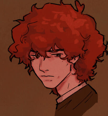 red, curly, neck length hair.